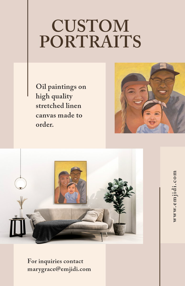 My custom paintings come in a variety of sizes, and I can work with most photo references. Each order is made on a high quality stretched linen canvas with professional grade oil paints to ensure the painting lasts for many years. Click here to order your custom painting today!